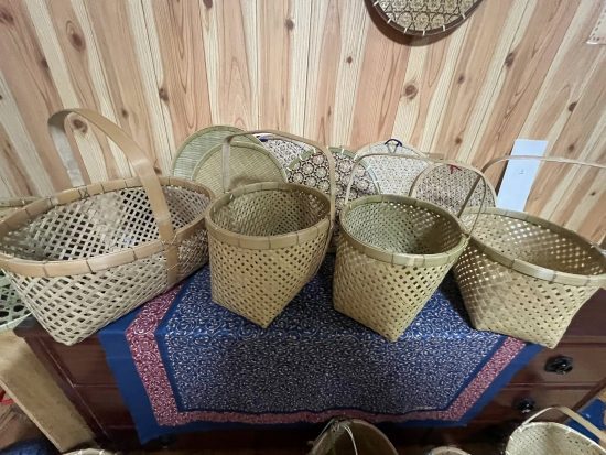 素敵な竹細工のかごや皿や、壁掛け飾りがおうちのなかに飾られて