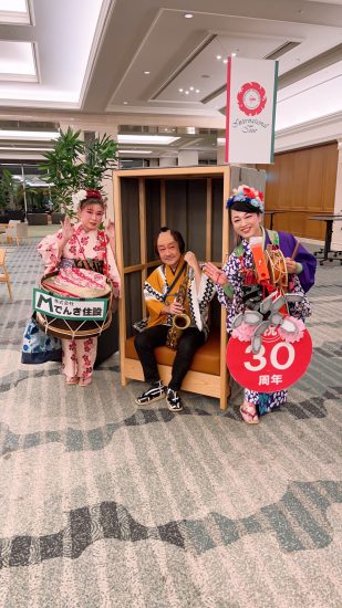 Mでんき住設様、創立30周年の記念旅行でのちんどんでしたので、てづくり看板やら仕掛けをつけての登場。